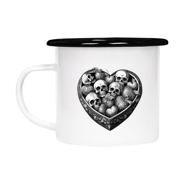 Smaltovaný plechový hrneček s černým nebo modrým ručně malovaným lemem, o průměru 80 mm a objemu 300 ml potěší každého dobrodruha.