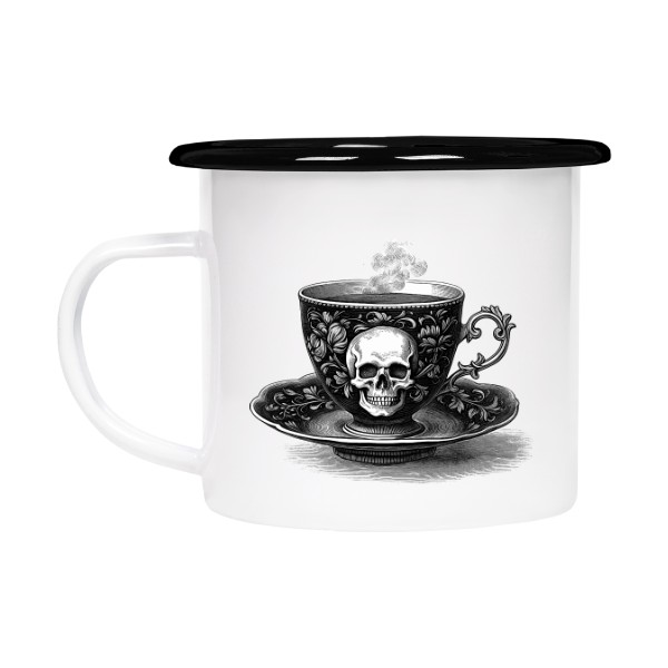 Smaltovaný plechový hrneček s černým nebo modrým ručně malovaným lemem, o průměru 80 mm a objemu 300 ml potěší každého dobrodruha.